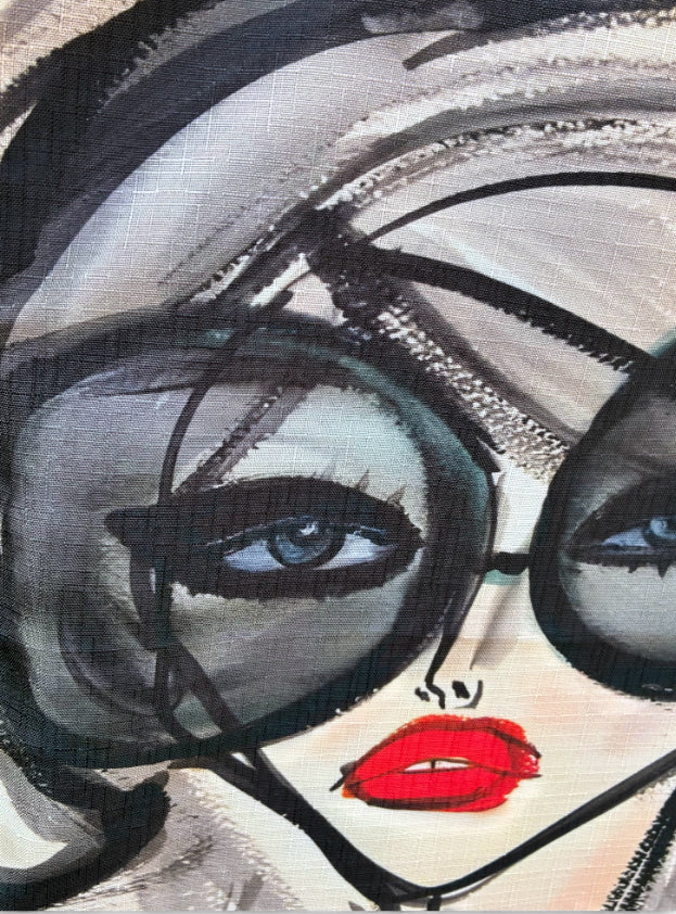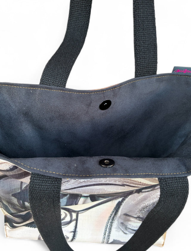 Un lato con tessuto fantasia, l’altro in tessuto ecopelle: interno foderato in alcantara con chiusura con bottone magnetico.