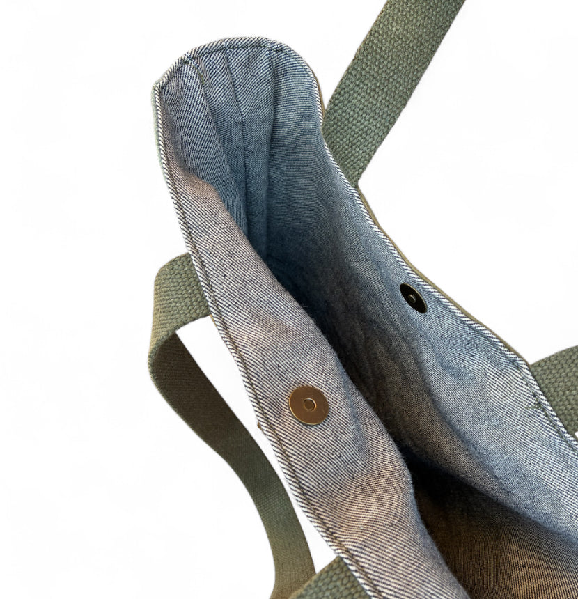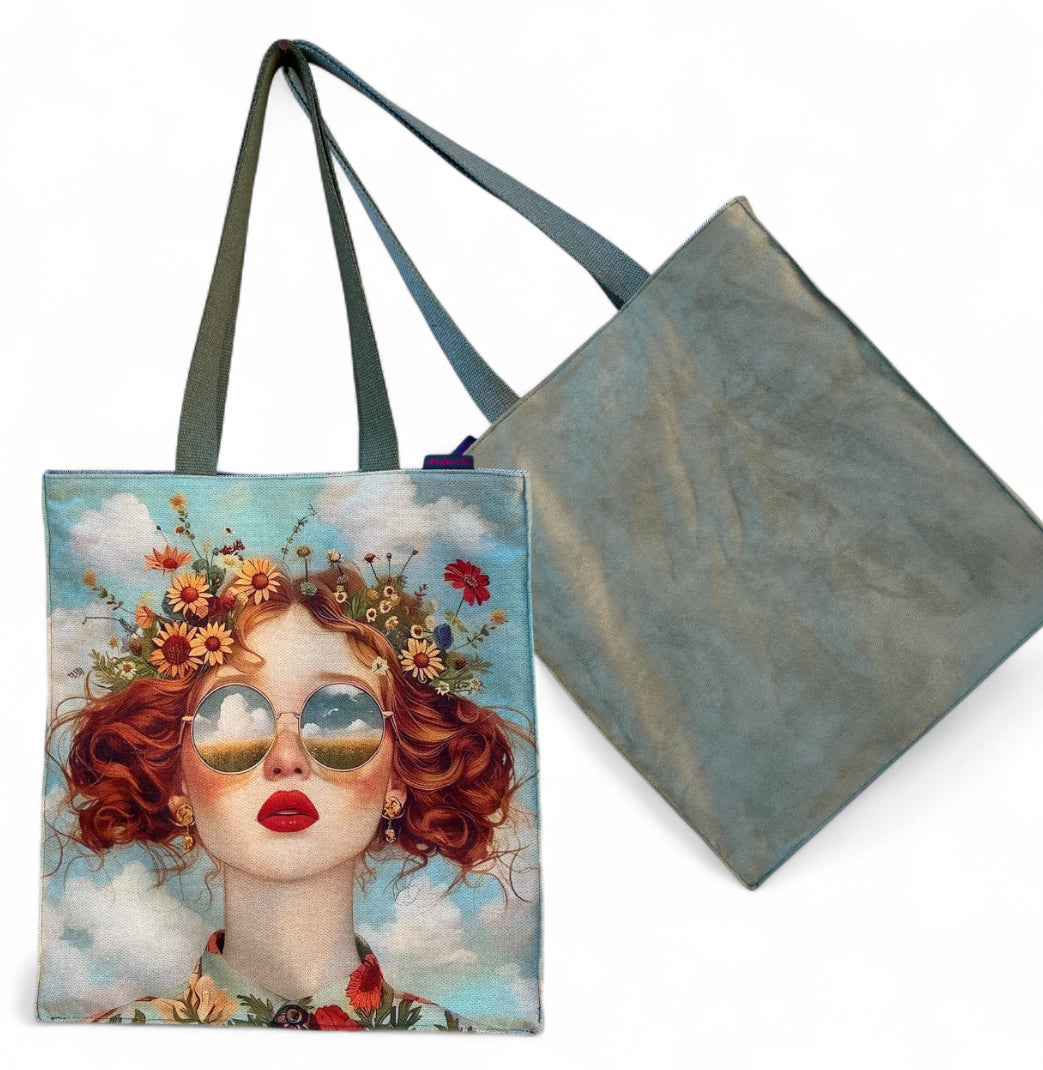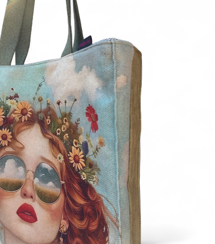 Un lato con tessuto fantasia, l’altro in tessuto alcantara: interno foderato in jeans con chiusura con bottone magnetico.