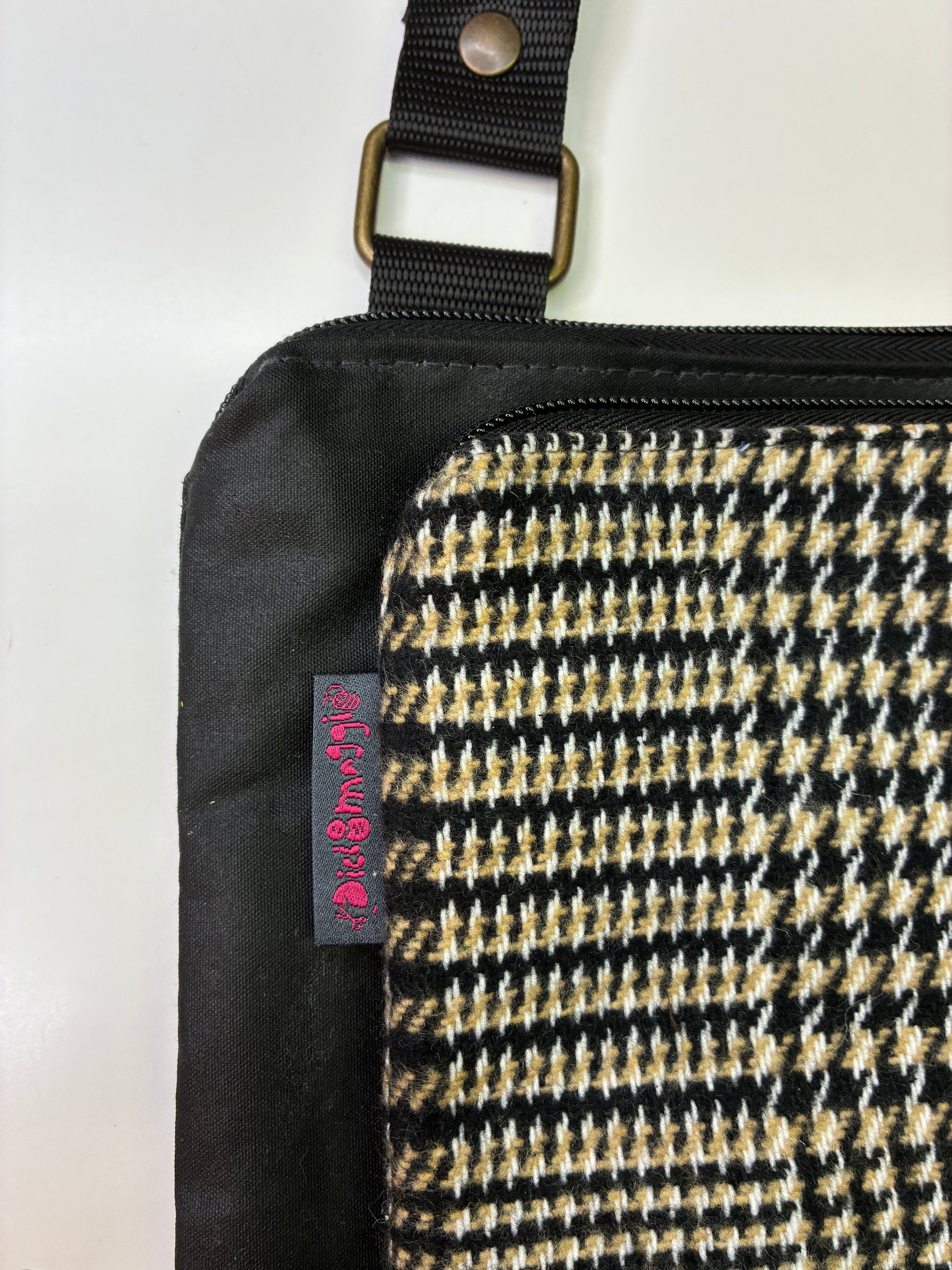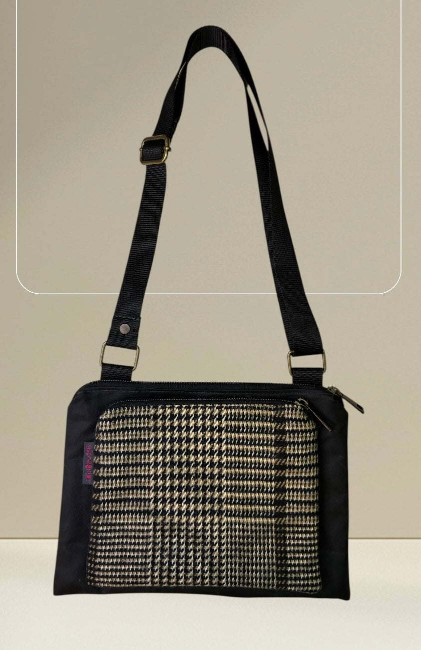 Tessuti utilizzati: cerato nero, tessuto pied de poule grigio, tracolla nylon grigio scuro.