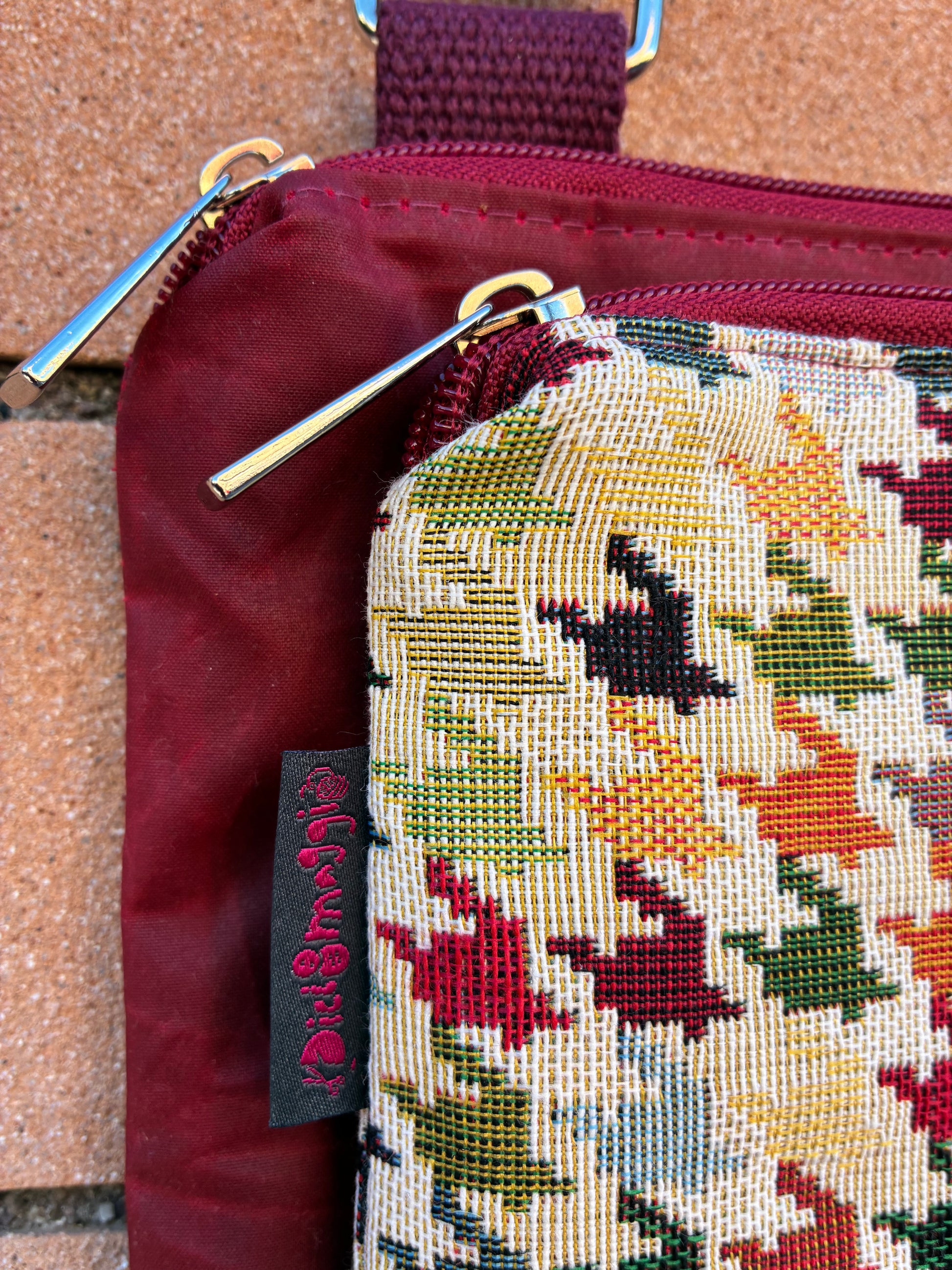 Tessuti utilizzati: cerato bordeaux, tessuto gobelin pied de poule, tracolla corda bordeaux.