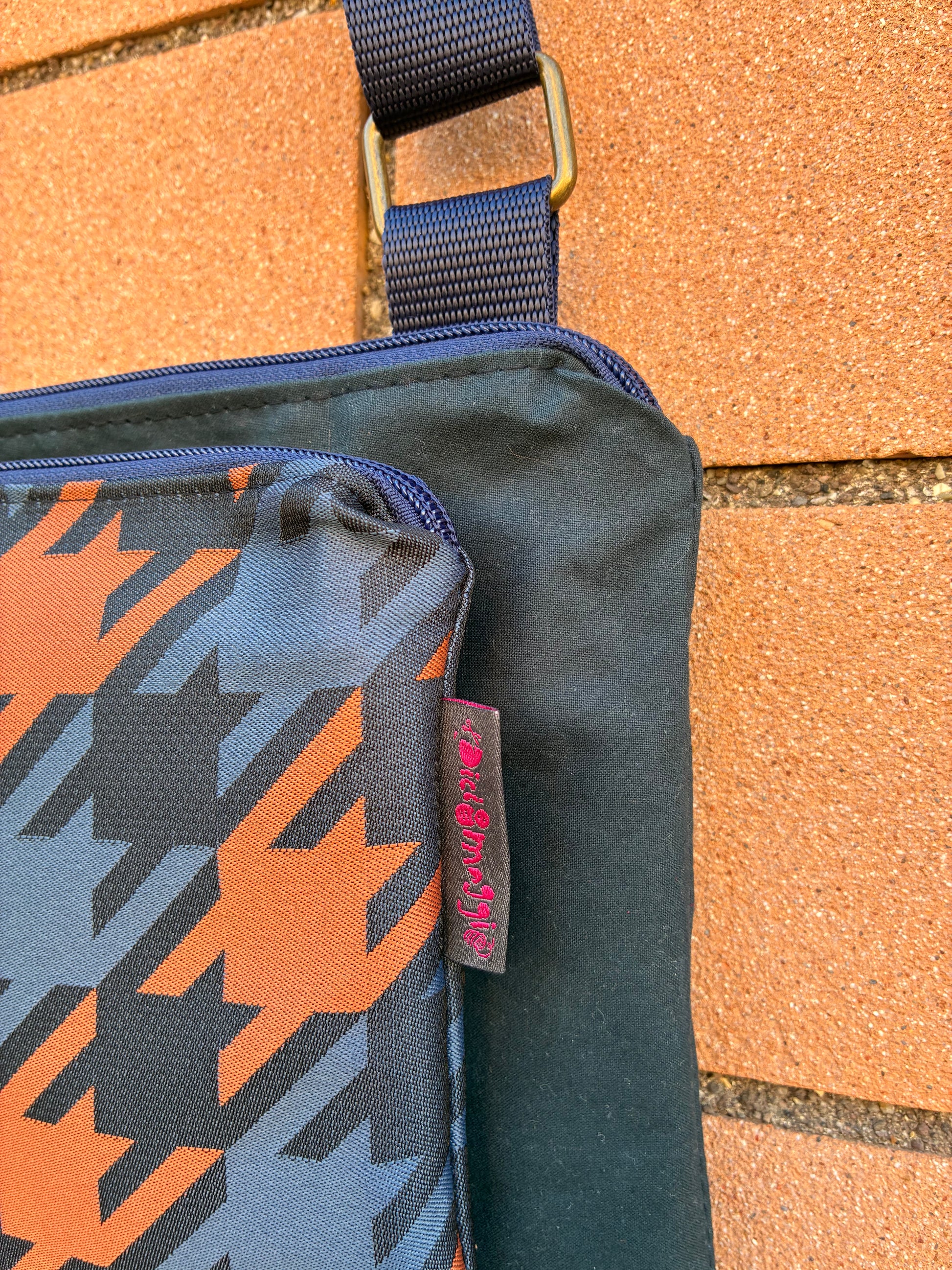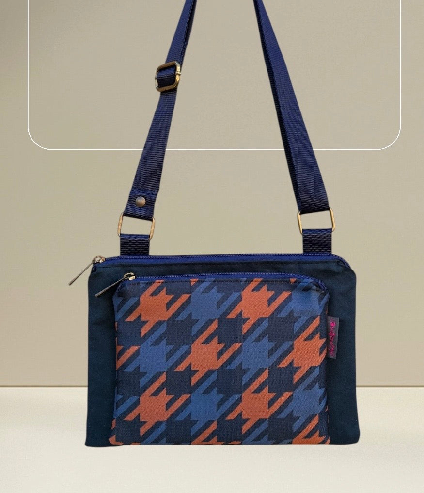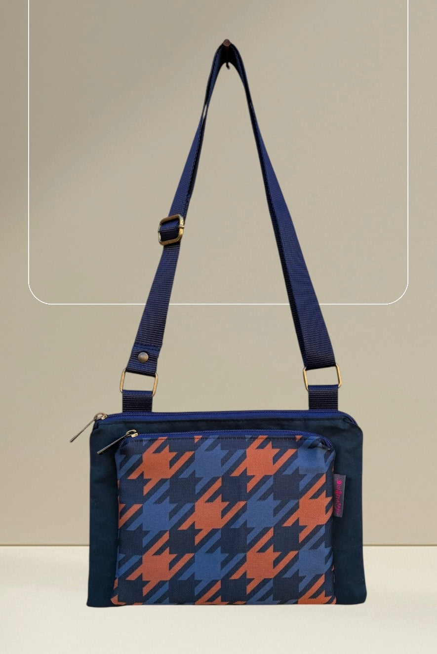 Tessuti utilizzati: cerato blu, tessuto pied de poule ruggine e blu, tracolla nylon blu.