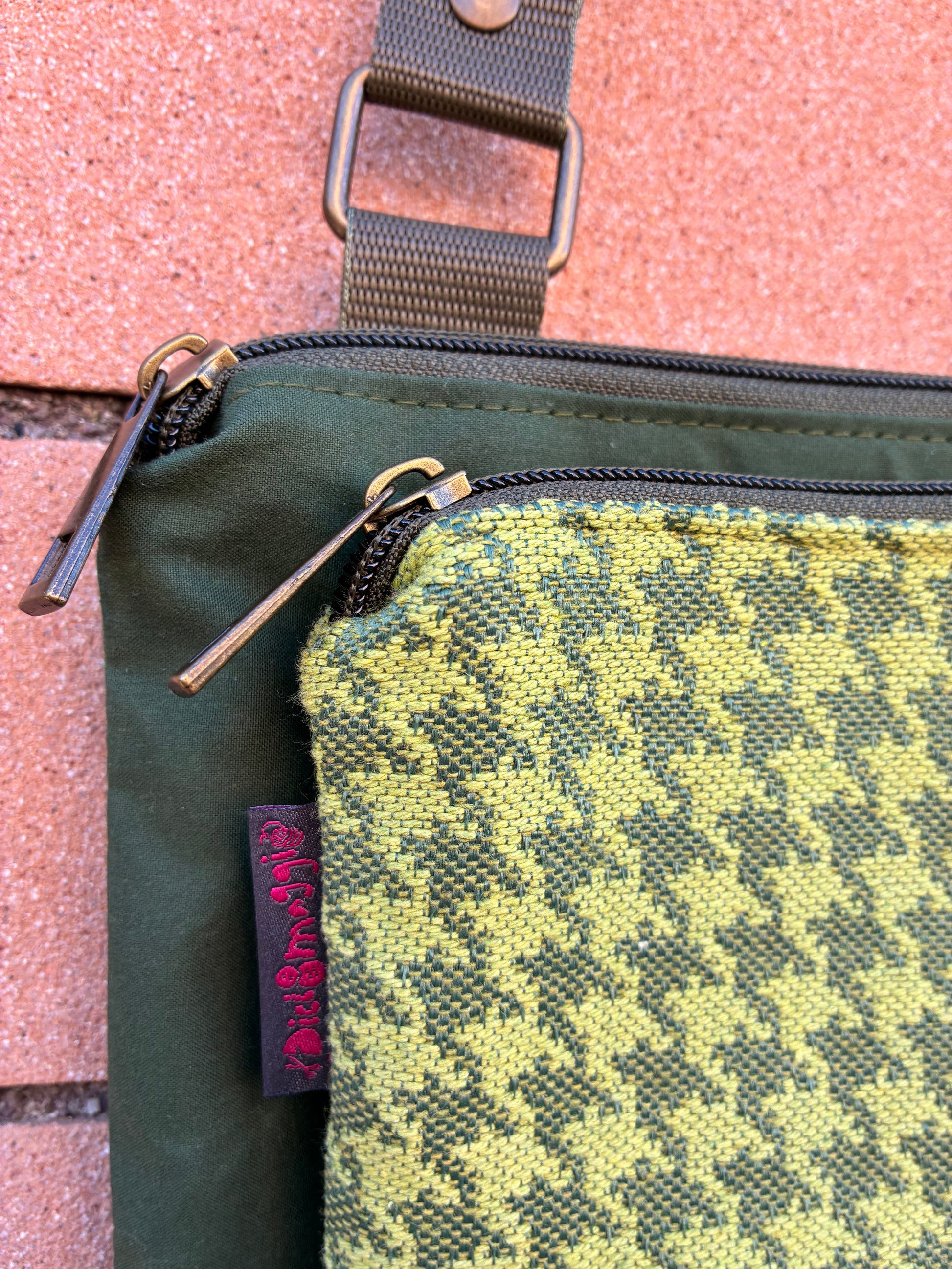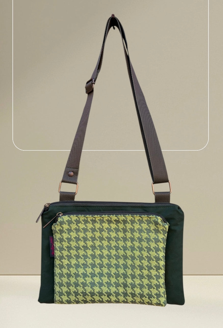 Tessuti utilizzati: cerato verde, tessuto gobelin pied de poule, tracolla nylon verde.